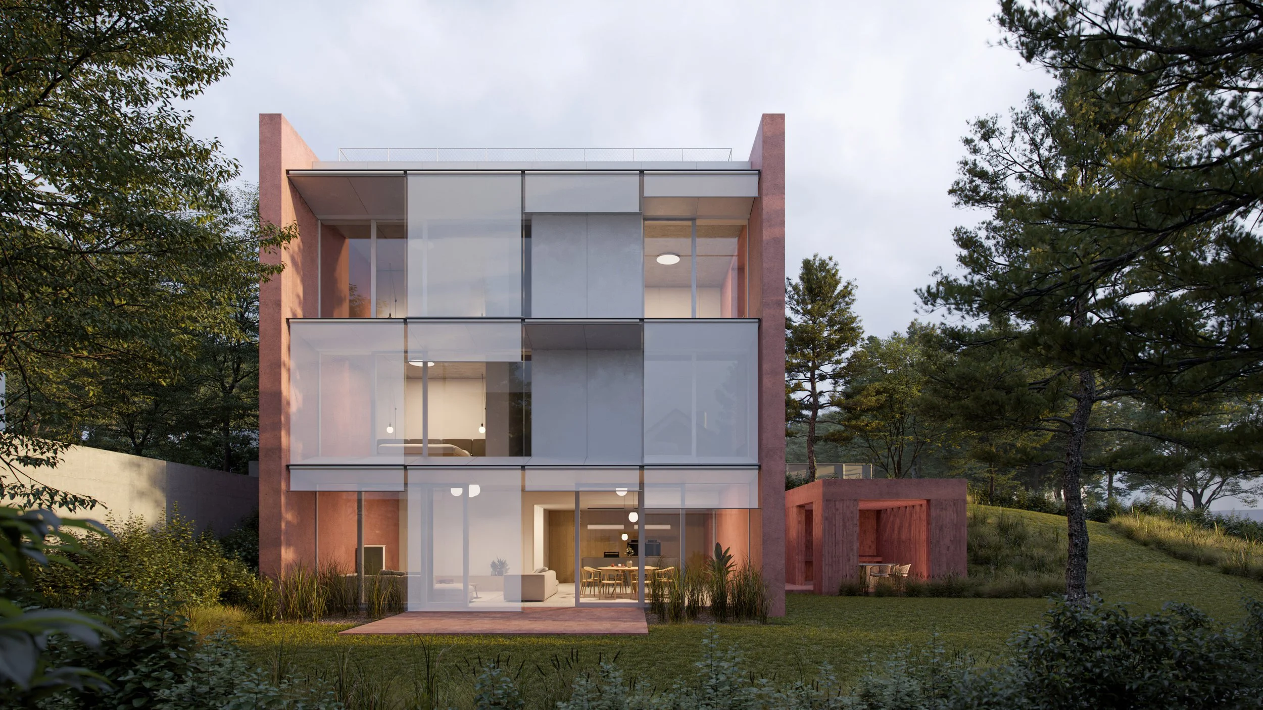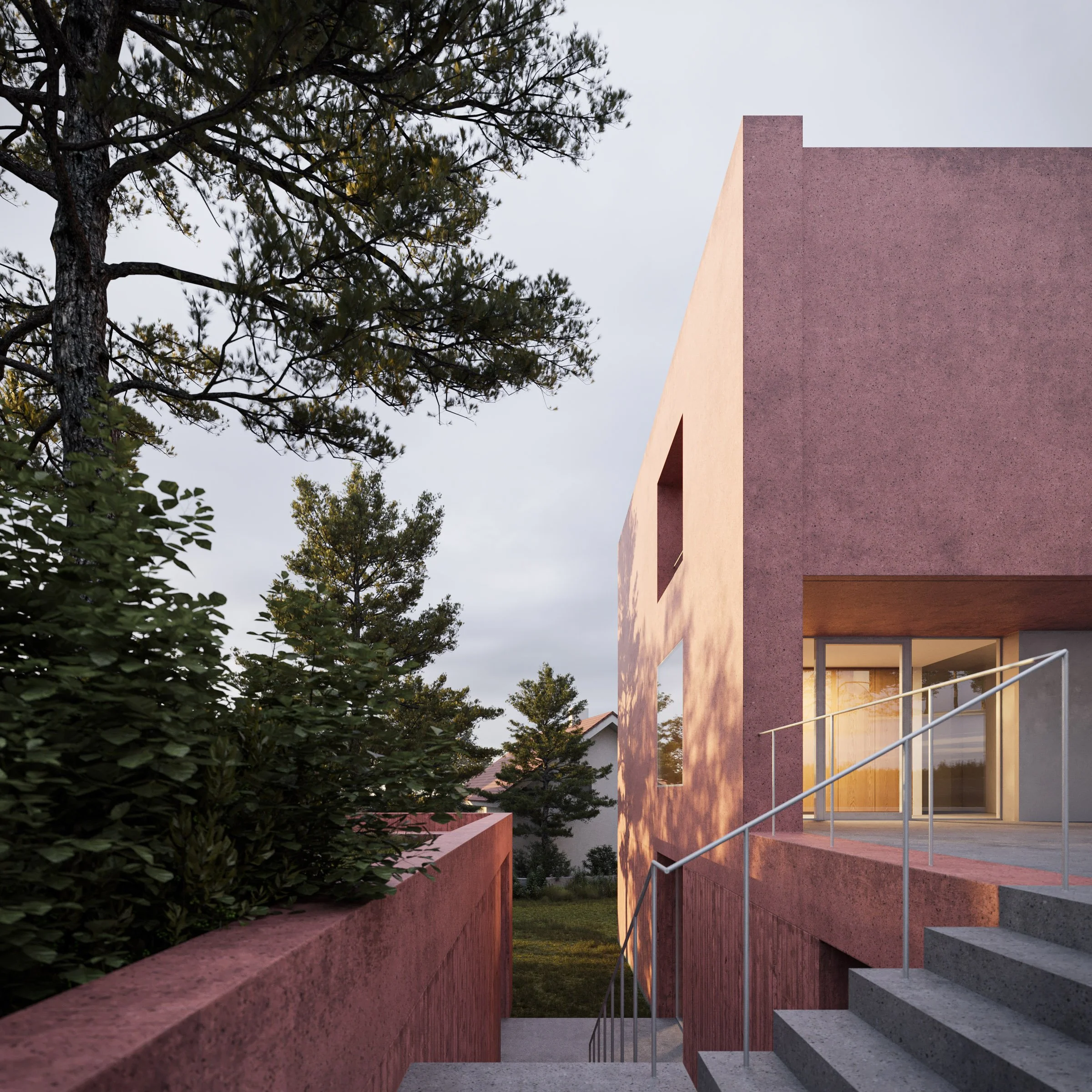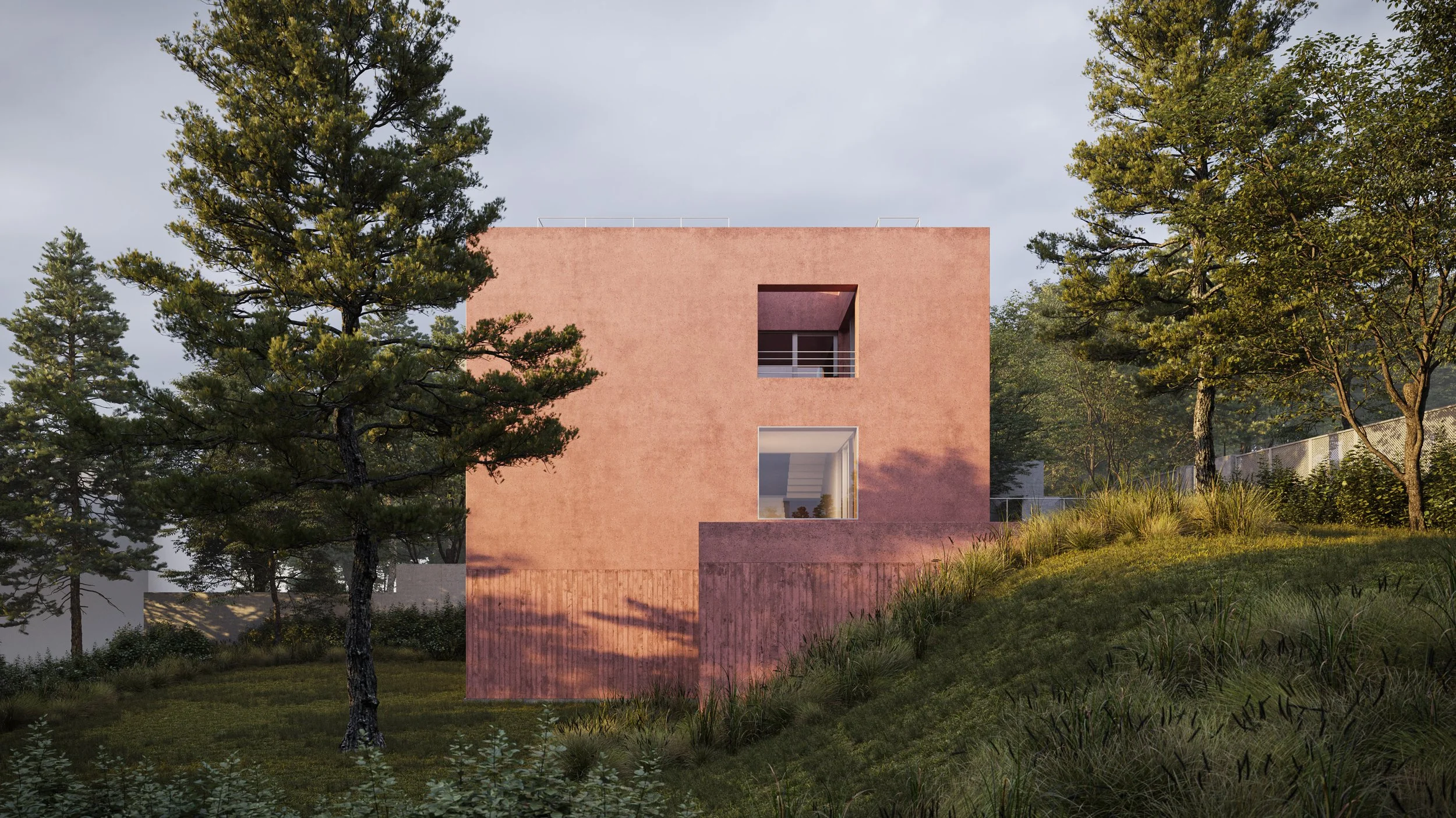 The project, designed by Cechvala Architects, is characterized by a carefully curated material palette dominated by red concrete. This bold and unconventional choice establishes a strong architectural language, reinforcing the sculptural form of the building while providing a distinct visual identity within its context. The material’s color and texture add depth and richness to the monolithic volume, amplifying its spatial and visual impact.